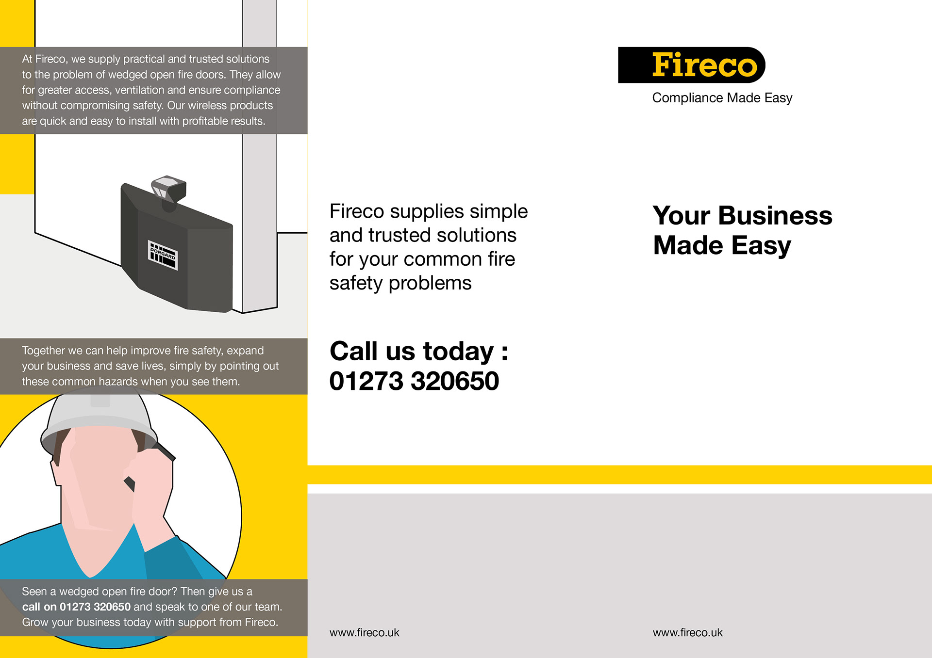 DL leaflet for local fire compliance company to promote their new piece of kit. Leaflets were to be handed out to local tradesmen that maintain office buildings to gain new business. Layout and Illustration created for Fireco, Brighton